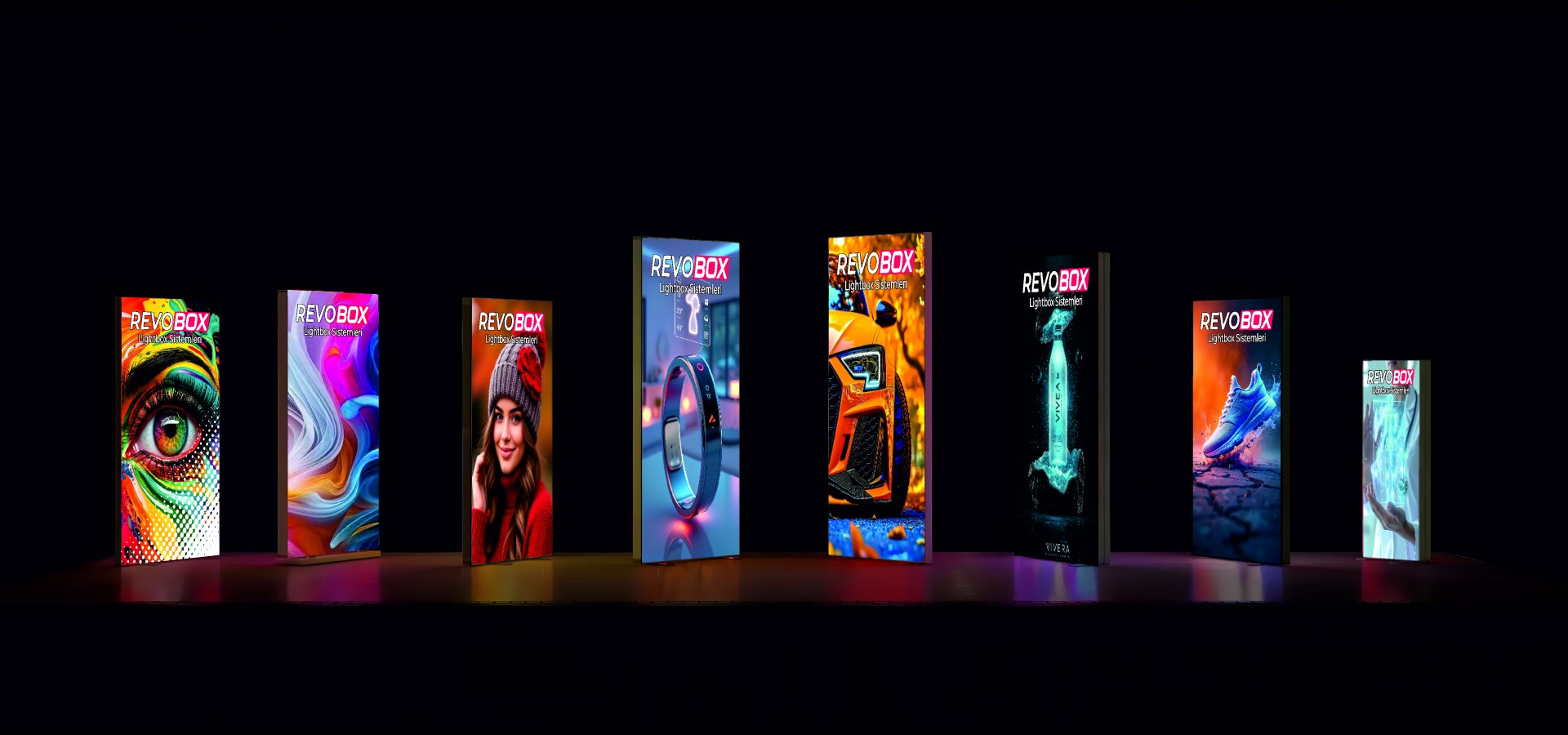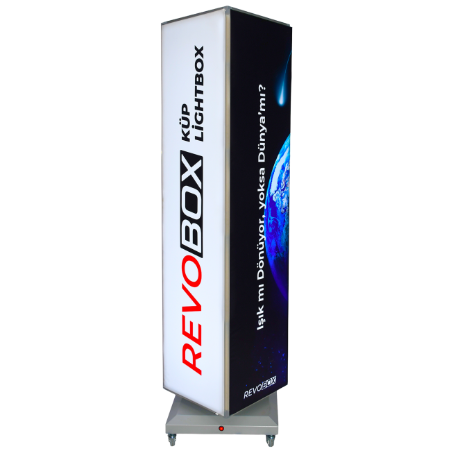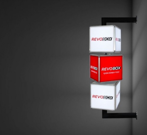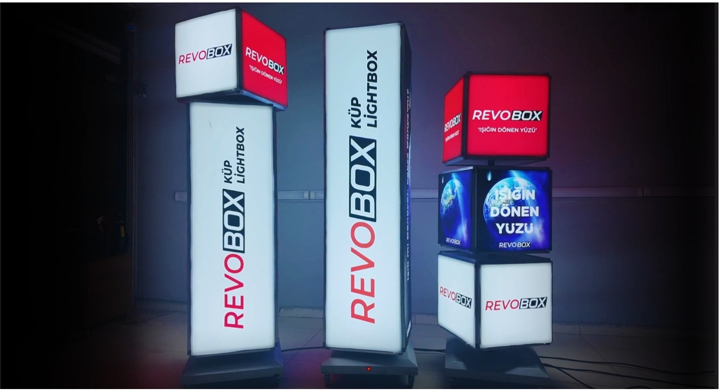 Revobox dönen lightbox tabela sistemleri; güçlü LED aydınlatma, dayanıklı gövde ve 360° dönüşle vitrinde, mağazada ve fuarlarda markanızı sürekli görünür kılar.